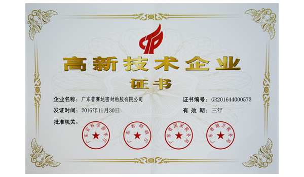 近日,公布了《2016年国家高新技术企业复审结果》,广东普赛达密封粘胶有限公司榜上有名,标志着公司顺利通过高新复审,再次被认定为高新技术企业,现已颁发证书。(证书编号:GR201644000573)