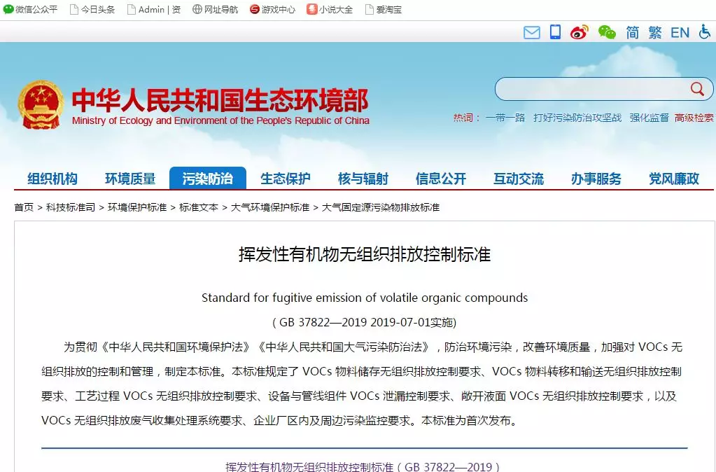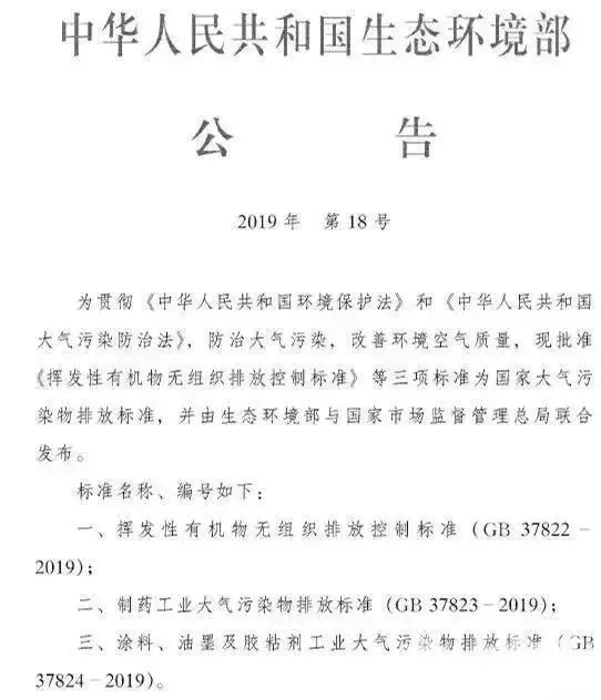 同时发布的还有《挥发性有机物无组织排放控制标准》(GB 37822-2019)、《制药工业大气污染物排放标准》(GB 37823-2019)等两项强制性国家标准。
