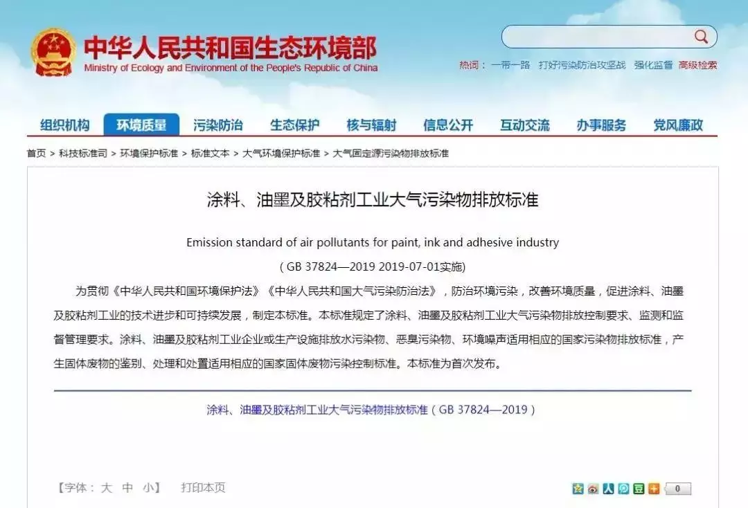 为贯彻《中华人民共和国环境保护法》和《中华人民共和国大气污染防治法》,防治大气污染,改善环境空气质量,2019年5月24日生态环境部联合国家市场监督管理总局发布了强制性国家标准《涂料、油墨及胶粘剂工业大气污染物排放标准》(GB 37824-2019)。