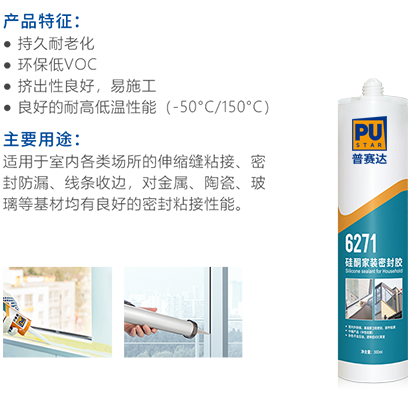 6271为单组分湿气固化密封胶,采用中性硅酮胶作为原料, 对环境无污染,与金属、陶瓷、玻璃、石材等多种基材具有良好的密封粘接性能。