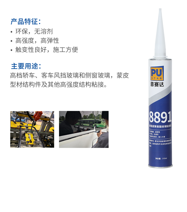 8891高强度聚氨酯玻璃粘接胶是一种单组分湿气固化聚氨酯胶,具有良好的内聚力和密封性能,对基材无腐蚀、无污染,对环境无污染。