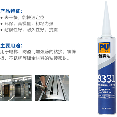 用于电梯、防盗门加强筋的粘接;镀锌板、不锈钢等钣金材料的粘接密封。