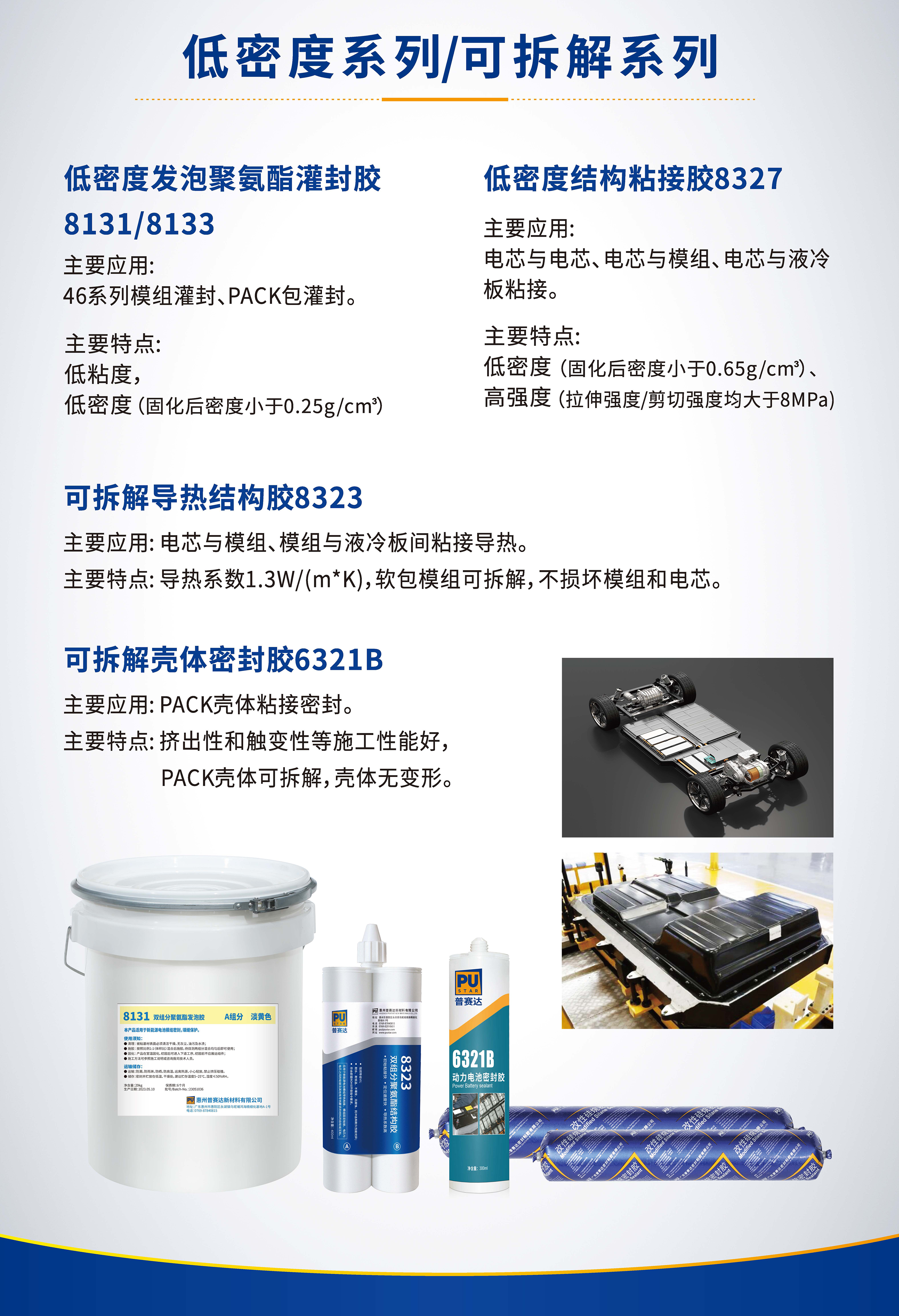 主要应用于46系列模组灌封、PACK包灌封。电芯与电芯、电芯与模组、电芯与液冷板粘接。电芯与模组、模组与液冷板间粘接导热。PACK壳体粘接密封。