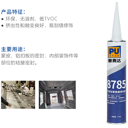 韧驰8785 环保型聚氨酯密封胶是一种单组分湿气固化 聚氨酯胶,环保低 VOC,具有良好的密封性能,对基材无腐蚀、 无污染,对环境无污染,与金属、玻璃等多种基材粘接性较好。